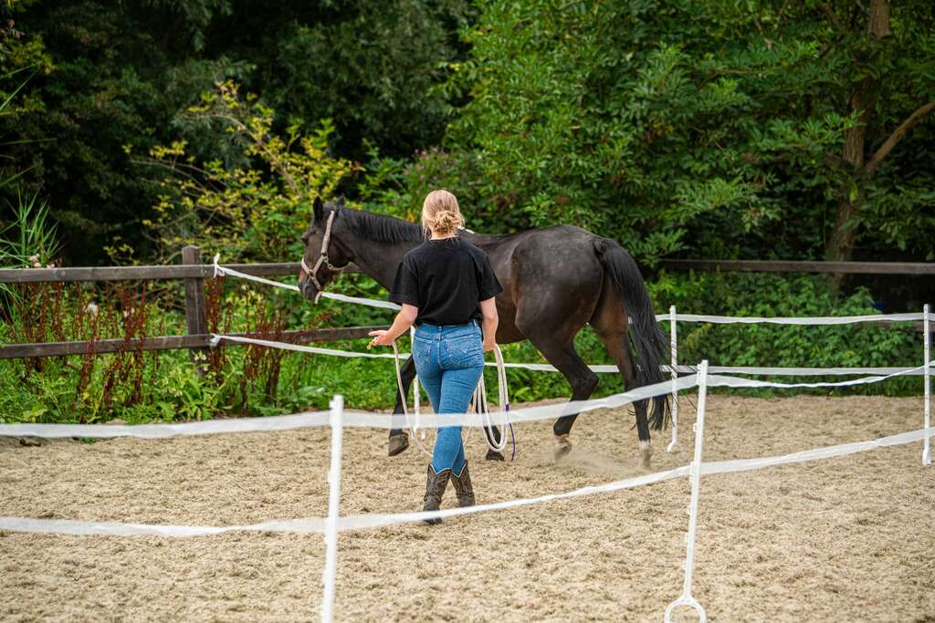 Bij het loswerken richten we op het controle hebben over het tempo en richting van het paard wat losloopt in de bak.