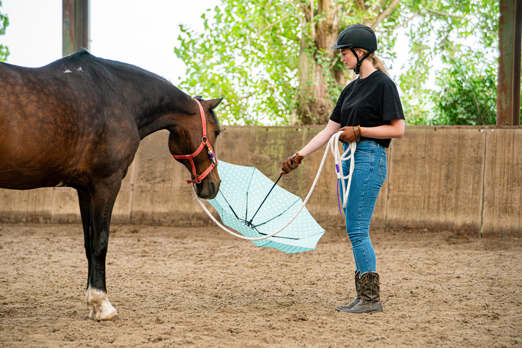 Schriktraining is een leuke afwisseling voor jou en je paard. Door een schriktraining leert je paard om te gaan met spannende of onbekende objecten.